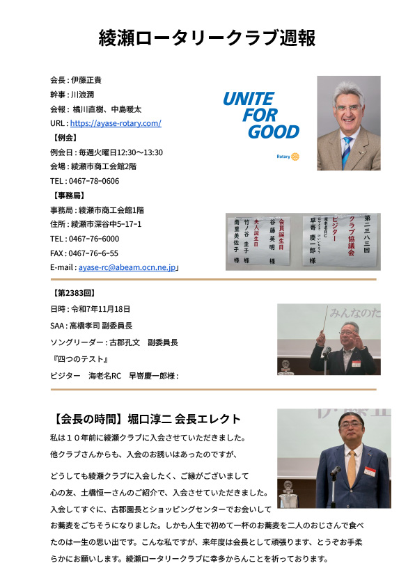 第2383回例会 週報 令和7年11月18日 をクラブ会報ページに掲載いたしました。