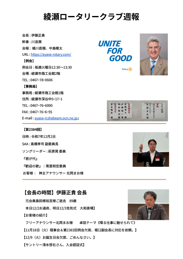 第2384回例会 週報 令和7年12月2日 をクラブ会報ページに掲載いたしました。