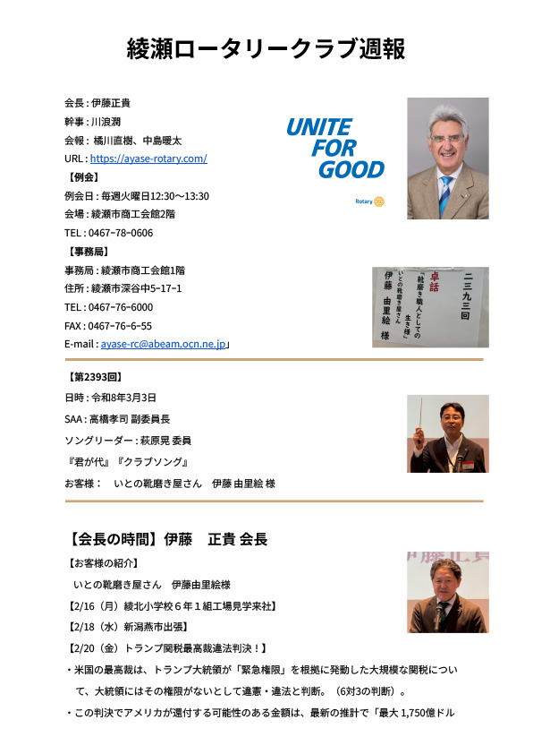 第2393回例会 週報 令和8年3月3日 をクラブ会報ページに掲載いたしました。