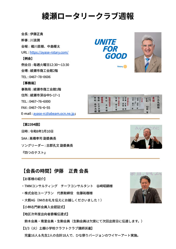 第2394回例会 週報 令和8年3月10日 をクラブ会報ページに掲載いたしました。