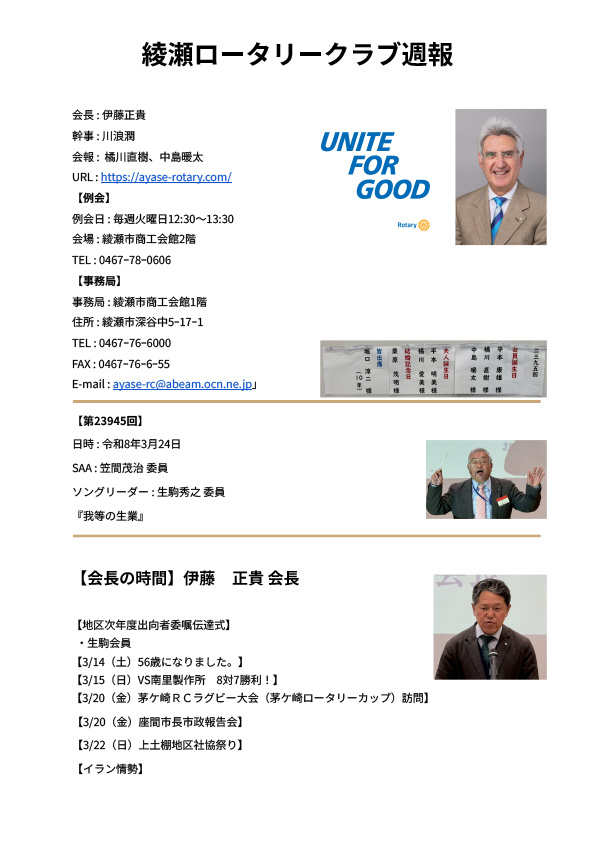 第2395回例会 週報 令和8年3月24日 をクラブ会報ページに掲載いたしました。